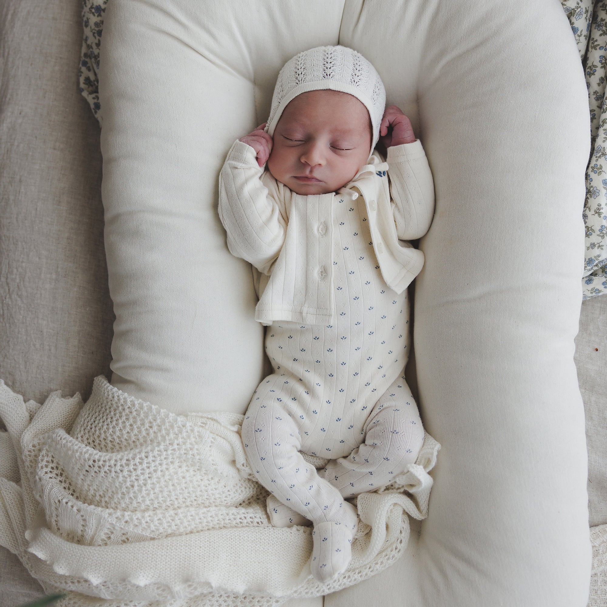 Floret Print Footie Set-Cream/Blue